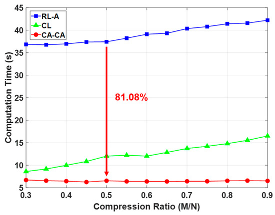 Here, we analyzed the computation time under different frameworks, as shown in Figure 14. The simulation settings are the same as in Table 2, except that the compression ratio is 0.5 and the number of training data is 600. It can be seen that (1) the computation time of the reconstruction is much higher than others. This is also the main reason leading to the highest computation time for reconstruction learning with alignment (RL-A). Therefore, compared with RL-A, our proposed reconstruction-free framework can save more computing resources; (2) the computational time of the ML-based identification model is related to the signal dimension and signal representation of the input data. Since the ECG signals are aligned in the compressed domain, the ML-based identification model can learn more detailed information about the signals. Our proposed CA-CA not only aligns the signals in the eigenspace, but also reduces the signal dimension. Hence, the although compressed alignment-aided compressive analysis algorithm requires additional pseudo-inverse and compressed-domain alignment, it helps to reduce the computational time of the SVM model for learning the compressed-domain alignment. Therefore, even if there are fewer system blocks in compressed learning (CL), compared with CL our proposed CA-CA framework still has a lower computational time. In short, compared with RL-A and CL, the computation time of our proposed compressed alignment-aided compressive analysis algorithm is reduced by 82.51% and 45.51%, respectively. Furthermore, we verified whether the same result can be obtained under different compression ratios. Figure 15 shows the computation time under different compression ratios with the number of training data = 600. It can be seen that compared with RL-A and CL, our proposed compressed alignment-aided compressive analysis algorithm also has less computation time under different compression ratios.