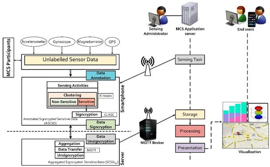 The data annotation module consists of smartphones with integrated accelerometer, gyroscope, magnetometer and GPS sensors as presented in Figure 1. During sensing activities, unlabelled data from these sensors are automatically labelled either as non-sensitive or sensitive data by the framework. This process is achieved using the K-means algorithm. All sensor data labelled as sensitive (raw sensor data containing location readings) are compressed then signcrypted using the spatial coding scheme and certificateless aggregate signcryption scheme, respectively. The signcrypted sensitive data is forwarded to the aggregators for aggregation. On the other hand, the MQTT broker handles all published “topics” in the framework and manages communication between publishers and subscribers. Meanwhile, the MCS server is a multi-threaded server system. New threads are used for incoming connections from MCS participants (referred to as mobile clients in later sections of this paper).