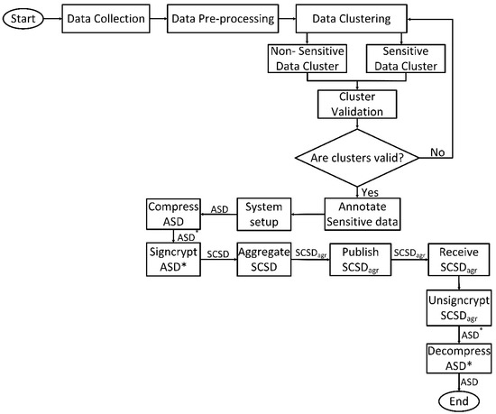 Figure 2 presents the implementation processes of the framework. The process starts with data collection (publicly available dataset) and ends with data decompression. Data signcryption starts after sensitive data have been labelled and validated. It is worthy of note that the data of interest in the framework is contained in the sensitive data cluster denoted as ASD (annotated sensitive data). The ASD is then compressed into ASD*. The compressed annotated sensitive data ASD* is then signcrypted to obtain SCSD (signcrypted sensitive data) and forwarded to the aggregators. After aggregation, SCSDagr is generated and sent to subscribed topics running on the MQTT broker. The MCS application server receives and unsigncrypts SCSDagr to obtain the compressed annotated sensitive data (ASD*). As a final step, the ASD* is decompressed to get the annotated sensitive data ASD.
