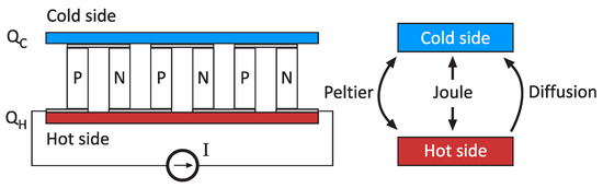 Peltier cells are built using semiconductor substrates such as Bismuth Telluride (BiTe). By defining the appropriate n-type and p-type structure, a temperature difference between two planes can be obtained (Figure 1). Peltier effect forces a temperature difference, which is distorted by the presence of Joule heating due to the driving current. Moreover, there is diffusion between the two plates due to heat transfer.