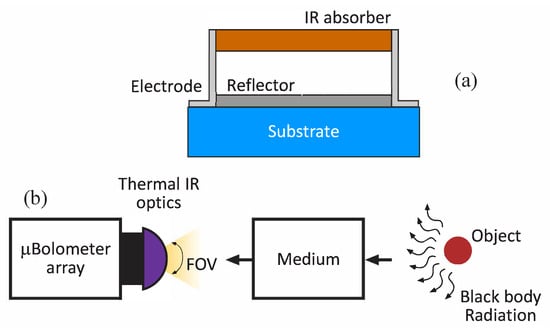 Microbolometers are passive devices in which the resistance varies with temperature changes. Those changes are transformed into a measurable quantity (voltage or current). The schematic block diagram of a typical microbolometer detector structure is illustrated in Figure 2a. The incident IR radiation increases the temperature of a material formed on the thermally isolated and suspended bridge, generating a change on its resistance related to its Temperature Coefficient of Resistance (TCR). This resistance change is electrically transferred to the Read-Out Integrated Circuit (ROIC) for further processing. To obtain high sensitivity, the thermometer is kept thermally insulated respect to the ROIC substrate. Figure 2b depicts a generalized use case scenario of thermography. The blackbody radiation emitted by an object propagates through a medium (usually the atmosphere) and is captured by the thermal camera.