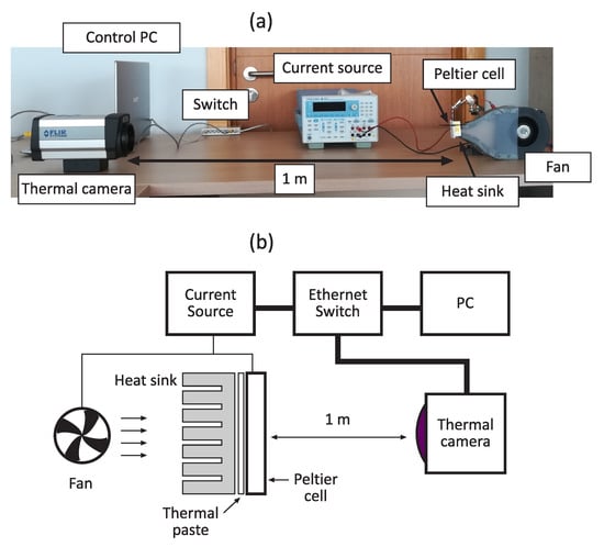 The experimental set-up (Figure 3) comprised a thermographic camera, a 8 cm Peltier cell, an Ethernet-controlled current source, an Ethernet switch, and a PC. Peltier effect is reversible depending on the polarization current’s direction. Therefore, any side can behave as a cooler or heater. However, for these experiments only the cold side has been considered for transmission purposes since a heat sink was coupled to the Peltier cell’s hot side using thermal paste. The use of the heat sink improves dissipation and therefore the maximum achievable temperature difference between layers, although it introduces thermal inertia, which would limit the maximum bandwidth. In addition, in order to further enhance dissipation (and hence the maximum achievable temperature gradient), forced air was introduced in a subset of experiments.