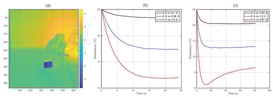 Example of captured thermographic image (a). For a driving current of 0.5 A without the fan activated, the cold side temperature reached 17 C. Temperature step responses with passive cooling (b). Temperature step responses with active cooling using a fan (c).