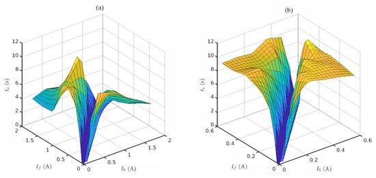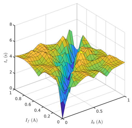 Despite the evident nonlinear behavior of the system, it would be possible to consider the system’s response as linear under a sufficiently slow pulsed-current regime. Nonetheless, frequency-domain analysis is not well suited due to the nonlinear behavior of the system. Therefore, time-domain analysis is preferred in this case. Figure 5 depicts the system’s settling time for different and values.