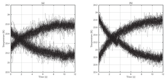 It can be observed that active cooling dramatically improves settling time. In addition, there is a significant difference between cooling () and heating times (). Therefore, depending on the selected current values, the bit duration should be limited to the slowest one (Equation (7)).