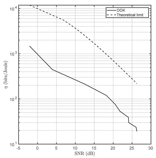 where is the spectral efficiency of the used modulation (1 for OOK), B is bandwidth, and is the average power consumption (Equation (11)).