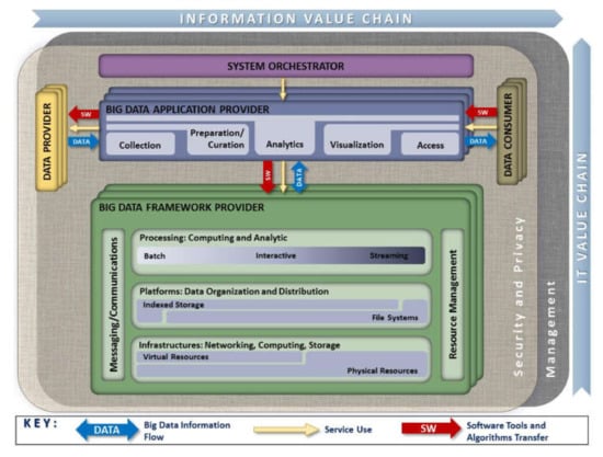 - NBDPWG—Reference Architecture Subgroup. NIST Special Publication 1500-6: Reference Architecture. In NIST Big Data Interoperability Framework; National Institute of Standards and Technology: Gaithersburg, MD, USA, 2019; Volume 6. [Google Scholar] [CrossRef]