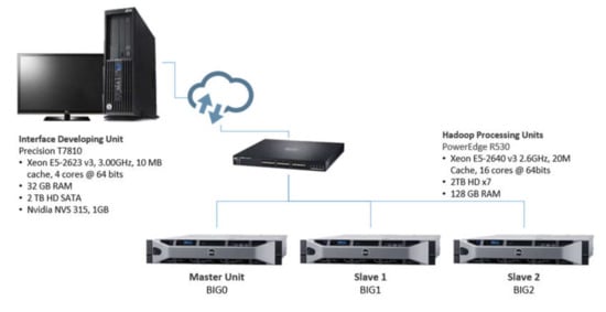 The Apache Hadoop processing cluster consists of one master unit and two slaves. Each unit has Xeon E5-2640 processors with 16 cores, 2TB × 7 hard disks, and 128 GB RAM. All of them run Linux OS. The cluster also has big data tools such as: