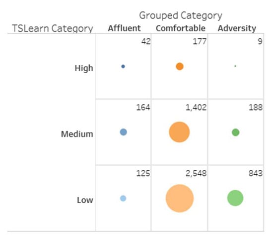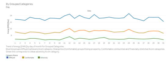 The case study considered five Acorn categories: affluent achievers, rising prosperity, comfortable communities, financially stretched, and urban adversity. However, rising prosperity, comfortable communities, and financially stretched groups presented reasonably similar trends. Therefore, for this study, these categories were grouped as a comfortable category. The new classification, referred in this paper as grouped categories, correspond to: