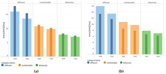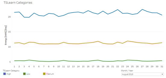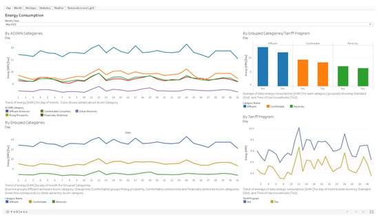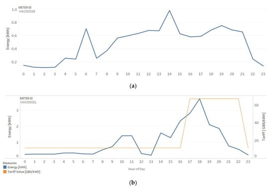 An exploratory case study used smart metering data published by the London Datastore from the Mayor’s Office of London. Data was collected by UK Power Networks as part of the Low Carbon London Program to investigate the impact of different low carbon technologies in the London electricity distribution network [63]. For this purpose, UK Power Networks installed around 5500 smart meters in the city of London. The meters recorded energy consumption at 30-min intervals between 2011 and 2014. During 2013, a group of 1100 households participated in a Demand Response Program using a Dynamic Time of Use tariff (ToU Group). This group had a variable electricity tariff throughout the day: high (67.20 GBX/kWh), low (3.99 GBX/kWh), or normal (11.76 GBX/kWh), while other households had a uniform rate of 14.228 GBX/kWh (Std Group).
