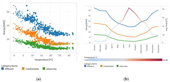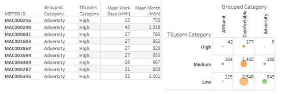 Acorn is a geo-demographic segmentation of the UK’s population. This classification segments households into six categories, 18 groups, and 62 types considering social factors and population behavior [64]. Acorn classification provides a general understanding of the attributes of a neighborhood by classifying postcodes into a category, group, or type. Acorn categories are affluent achievers, rising prosperity, comfortable communities, financially stretched, urban adversity, and non-categorized customers.