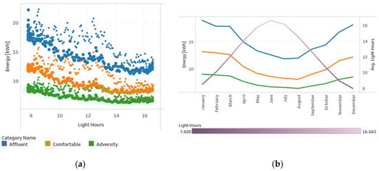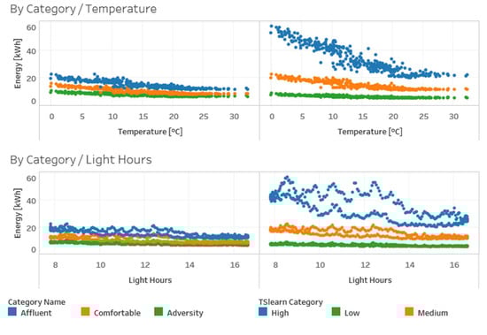 There is a high relation between variables like temperature and light hours with users’ electricity consumption. In addition, it is important to notice how these changes influence specific consumption habits. For example, the consumption between workdays is, in general, lower than during holidays. However, this behavior is different in the summer months, which may be related to seasonal changes in temperature.