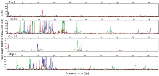 T-RFLP is a useful tool in environmental microbiology for assessing the diversity of microbial populations and shifts in communities. Furthermore, this method is widely used in analysis, especially for soil samples [29]. One of the common matrix genes is bacterial 16S rDNA [32,33], but other genes may also be used for this technique: fungal ribosomal genes [34,35], archaeal 16S rDNA genes [36,37], and functional genes [38,39]. T-RFLP fingerprinting is a pattern of t-RFs, the composite of DNA restriction fragments with characteristic lengths. The multiplex PCR approach allows for the simultaneous amplification of genes from different microbial groups in one reaction and this is a significant advance in relation to t-RFLP.