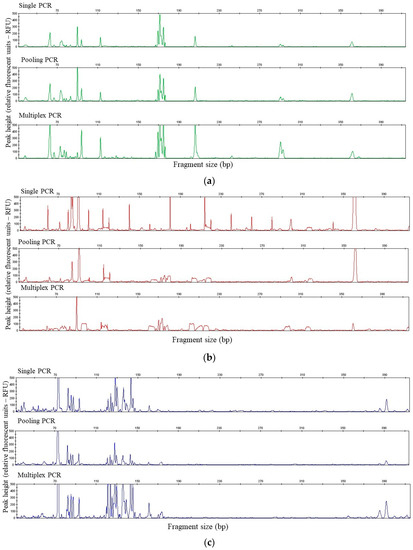 Two strategies for the PCR approach are possible, single and multiplexing, and both were tested in presented study. The multiplexing approach requires a preliminary check for primer compatibility and the possibility of efficient co-amplification. Another important aspect is that the pair of primers should have similar melting temperatures (Tm) and should not contain large regions of complementarity. Multiplexing-pooling strategies (pooling samples after a single PCR) are generally easier to implement due to the different efficiencies of primers, and these were also included in the presented research. The amplification step of multiplex PCR may be difficult to perform due to the equal number of amplicons for each tested group, particularly since that effectiveness depends on the fluorescent dye used. In pooling strategies, this inconvenience may be eliminated by adding different amounts of each individually amplified PCR product, which allows for the achievement of similar peak intensities. In both strategies, it is necessary to use different fluorescent dyes to label the primers. In selecting dyes for analysis, one should consider spectral calibration reagents for the dye sets. Furthermore, when a fluorescent dye is assigned to PCR products, the most intense dyes should be matched with PCR products with a low recovery rate; it follows that less intense dyes should be used with products with a good recovery rate [50]. In Table 6, helpful information about the emission spectra and the intensities of a selection of fluorescent dyes [51] are presented; these parameters are needed for selection and matching of fluorescent dyes.