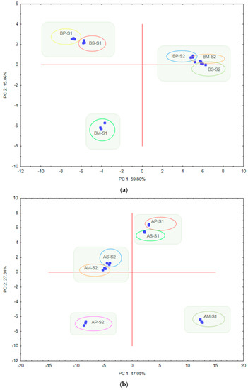 PCA grouped the various t-RFLP approach treatments separately with respect to the soil type classified according to the World Reference Base for Soil Resources (WRB) [31] as Brunic Arenosol (S1) and Abruptic Luvisol (S2). Most probably this grouping mainly resulted from the dissimilarities in the soil characteristics (e.g., different nutrient content, soil texture or pH). Moreover, PCA grouped the multiplex and single t-RFLP approach treatments for S2 together, both for archaea and fungi (Figure 3b,c). This result is consistent with the calculated similarity index (Jaccard’s coefficient) (Table 4). Moreover, in Table 5 loadings for the most significant variables (correlation coefficient ≥0.9) along PC1 and PC2 resulting from principal component analysis of relative abundance (RA) and area (AR) of peaks from both soils are presented.