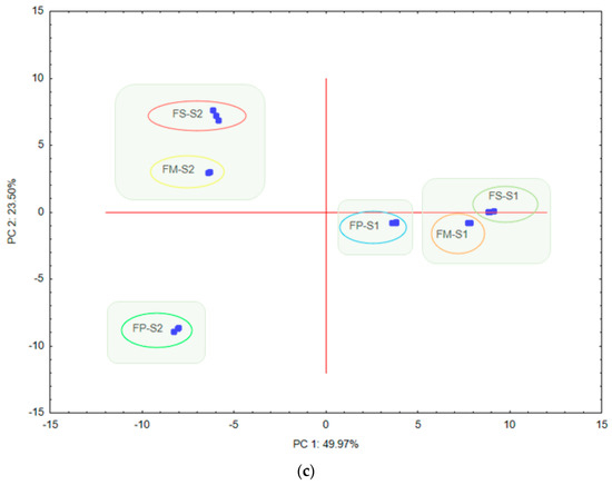 Principal components analysis (PCA) of the three t-RFLP approaches was used to arrange the two types of soil samples (S1 and S2) depending on the HaeIII enzyme used to create the pattern (Figure 3a–c).