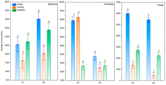 The results indicated that although the significant differences were found in the values of average area of peaks between tested approaches of t-RFLP (Figure 4), the number of peaks in all tested assays was similar for bacteria and fungi, and significantly higher in the multiplexing approach in comparison to multiplexing for archaea (Tables S1 and S2). The results showed that use of the specific t-RFLP approach was dependent on the soil type. Pearson correlation coefficients indicated significant correlations (p < 0.05) between single, pooling and multiplexing approaches for bacterial and fungal results (−0.863 and −0.846) on S2 soil and between single and pooling approach for archaea and fungi (0.957) on S1 soil.