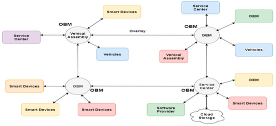 The vehicles communicate and exchange information with them, and the OBMs encapsulate the information and publicly distribute it through a shared ledger. The vehicles share their public keys with the OBMs, but they never reveal their real identity, enabling them to be anonymous, and the private information is stored in the on-board memory of the vehicles and exchanged only when the user wishes to share it, for example when they need to provide an emergency service to a particular location of the vehicles. The design is shown in Figure 1.