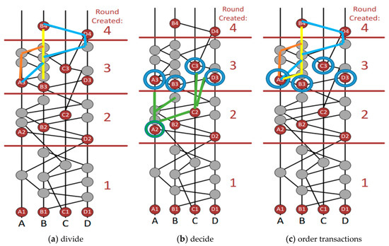 - Virtual Voting and Round Creation: The transactions, consensus, and nodes are some of the main terms for understanding virtual voting. Virtual voting is somewhat similar to democratic voting. It determines a witness’s vote based on witnesses or events. In technology such as Bitcoin, a block makes consensus decisions if it is fast enough to be the first to solve the hash, but in virtual voting, the decision node is selected through a complicated process consisting of three stages: (a) divide, (b) decide, and (c) order transactions. The process of round creation is shown in Figure 5. Here, The Hashgraph is broken into rounds. Each time an event can connect more than 2/3 of the first events of the current round by more paths than 2/3 of the node population is created a round. In doing so one event sees the other event strongly. A3 is strongly seen in Figure 5 (Population of node = 4, Path Number Connection = 3). Each node of the newly created round must acknowledge whether it contains the data of the previous node or not. Here previous node refers to the node of the previous preceding round. Verification is done once this acknowledgment is received. In this figure all first nodes in the third round must have decided on the data in A2. The final stage is to collect answers from the third-round nodes. The fourth-round nodes are required to do so. They need to see the third-round node very strongly. When one of the fourth-round nodes succeeds in gathering a super majority (more than 2/3 of the population) of positive votes over the data in the second-round then this data is found to be consensus.