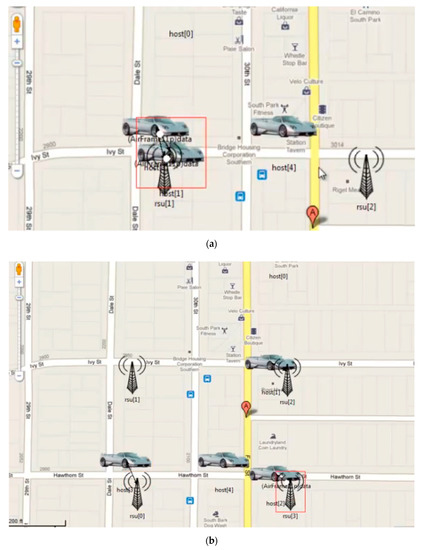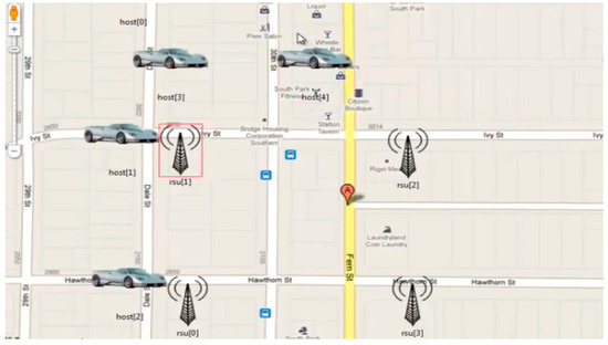 The proposed model based on the hashgraph was validated through a simulation on OMNeT++, as well as by fabricating a piece of IoT hardware to synchronize the model during the deployment. OMNeT++ provides a network simulation facility in the form of a modular extensible component-based C++ library. Figure 6 shows the simulation of the proposed solution followed by the bandwidth allocation and message passing between the vehicles as depicted by Figure 7a and Figure 7b, respectively.