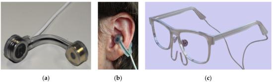 The OxyFrame device shown in Figure 1a,b was designed and manufactured to record physiological signals at the cavum conchae in transmission mode. The cavum conchae is an optimal pulse oximetry body site for several reasons: The proximity of the ear to the trunk makes it less susceptible to centralization and poor peripheral perfusion artifacts, detection of desaturations might be faster, and its location being closer to the brain probably enables a more accurate reflection of cerebral oxygenation [15]. Further, at ambulation, movement of the head is less pronounced than movement of the arms so that motion artefacts can be reduced.