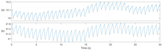 Examples of photoplethysmographic (PPG) signals at (a) the red (PPG-R) and (b) the infrared wavelength (PPG-IR). Note that the amplitude of these signals is in arbitrary units.