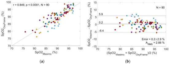 Performance of the OxyFrame device compared to a standard sensor (MASIMO) in patients. (a) Correlation plot SpO2 measurement by OxyFrame versus MASIMO. (b) Bland-Altman plot SpO2 measurement by OxyFrame versus MASIMO. Measurements of the same patient have the same color and shape.