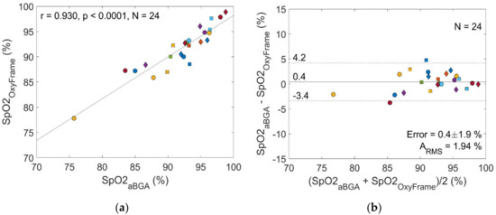 Performance of the OxyFrame device compared to arterial blood gas analysis in patients. (a) Correlation plot SpO2 measurement by OxyFrame versus arterial blood gas analysis (aBGA); (b) Bland-Altman plot SpO2 measurement by OxyFrame versus aBGA. Measurements of the same patient have the same color and shape.