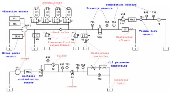 Figure 1) consists of a primary circuit for the load control and two subsystems with the cooling and filtration circuits, which are connected via the oil tank to the primary circuit. Several typical system failures, such as internal pump leakage, pressure leakage in the accumulator, delayed valve switching or reduced cooling efficiency are studied. The authors collect measurements from 17 sensors (