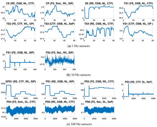 Table 1 shows the details of the measurements of the 17 sensors, which comprise 14 physical sensors—pressure (PS1–PS6), motor power (EPS1), volume flow (FS1–FS2), temperature (TS1–TS4) and vibration (VS1)—and three virtual sensors denoting computed values—efficiency factor (SE), virtual sensors for cooling efficiency (CE) and cooling power (CP). For each sensor, the measurements are recorded during a load cycle of 60 s. As stated in