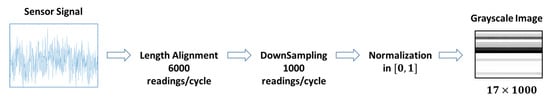 The first step upsamples sensors readings to the maximum sampling rate of 100 Hz. This implies an increase in the sampling frequency for the volume flow sensors (FS1/2) by 10 and an increase by 100 for the temperature and vibration sensors (TS1–TS4). The result is an aligned dataset with 6000 readings per minute (cycle) for all 17 sensors. As this frequency might be quite high, the dataset is downsampled by taking the average of each six consecutive readings of a sensor yielding a dataset with 1000 values/minute for each sensor. In the following, the data readings of the sensors are normalized in the range. The motivation behind downsampling (in fact, only readings of pressure and motor power sensors are affected) is to obtain a more treatable and reasonable image size for the experiments as the training time of a CNN model increases with the image size.