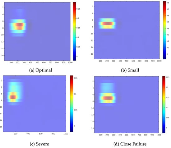 Figure 9 shows the occlusion sensitivity maps of the Internal Pump Leakage target for states No Leakage, Weak Leakage and Severe Leakage. For all three cases, complex combinations of sensor readings are contributing to the prediction of the respective states, where positive and negative contributions are alternated along with the 1000 sensor readings. An analysis of the occlusion map of No Leakage (see