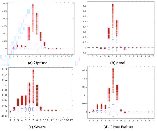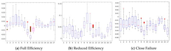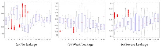Figure 5 shows the occlusion sensitivity maps of the Valve target for the different degradation states. The sensor patterns with positive contributions to the prediction of the states remark all similar regions highlighting especially the contribution of sensors #6 to #9 (pressure sensors). The similitude of the maps indicate that similar sensor combinations are relevant for the predictions hinting that the absolute value of the sensor readings may be decisive for the prediction of the state rather than different combinations of sensors. Namely, pressure sensors P1, PS2, and PS3 are the sensors with the highest positive contribution in the prediction of all three states according to the boxplot representation (