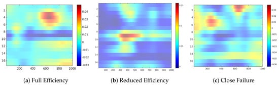 Figure 7 highlights the relevant sensor readings for the Cooler target. In this case, more complex sensor combinations than those of the Valve target are visible in the map suggesting that a higher number of sensors are relevant for the prediction of the degradation states. Different areas of the image are highlighted for each case. Interestingly, the activation pattern of Reduced Efficiency appear to be complementary to those of Close Failure (See