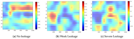 Figure 9b,c), the maps show that the activation patterns of these states are complementary, as the positive contributing regions in each case are not contributing in the prediction of the other state. This attrribution hints towards a clear separability between the states Weak Leakage and Severe Leakage in the CNN model.