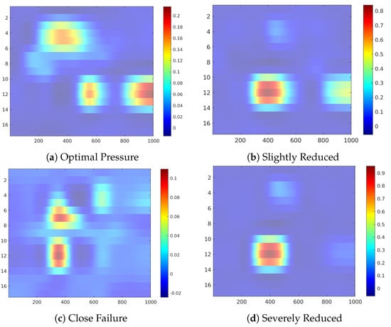 Figure 11). The heatmap visualization depicts the absolute value of the contribution to the specified class prediction (red color for positive and blue colors for negative contributions). Such heatmap representations are useful for the visual recognition of the most relevant sensors for the prediction (regions highlighted in red colors) and reveal sensor combinations with common patterns in the contributions. Note that a sensor can have both positive and negative contributions along the sequence of 1000 measurements.