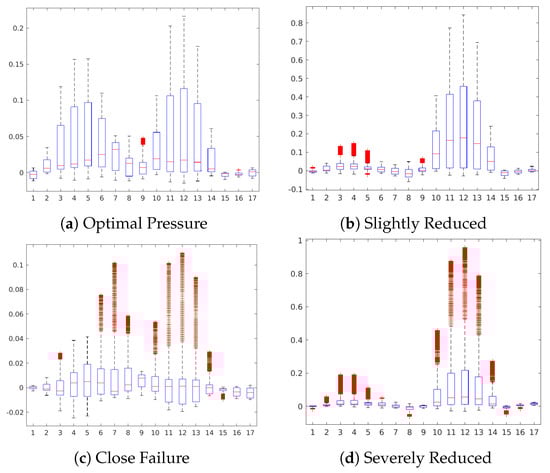 Figure 12 depicts the distribution of the attribution values of each sensor for the prediction of the different degradation states. The sensitivity maps of Optimal Pressure and Close Failure (