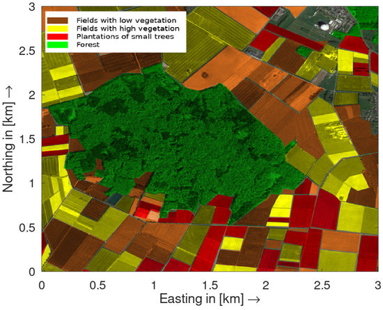 A typical German rural terrain in the Eifel region of western Germany with the colored different terrain groups specified for the bistatic measurements and clutter analysis.