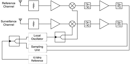 In Figure 2 the structural diagram of the dual-channel bistatic radar receiver is shown. The receiver is designed for the X-band and can receive signals with a bandwidth of 100 MHz using a tunable local oscillator. Both receiving channels have an identical front-end design. Behind the receiving antenna, a limiter protects the following hardware from being damaged by too high reception power, e.g., by a strong direct signal component. A quad-Vivaldi element arrangement was used as antenna. Then the received signals are first amplified using a low-noise amplifier and down-converted to an intermediate frequency using a common local oscillator for both channels. After subsequent filtering for image suppression and further amplification, the signals are sampled in the third Nyquist band at a sampling rate of 250 MHz. This sampling technique minimizes interference effects near DC.