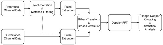 The corresponding samples of the incoming pulse are also extracted in the surveillance channel. The pulse pairs are then Hilbert transformed to generate complex signals. The corresponding range profiles are calculated by cross-correlating the reference and surveillance channel pulses. This calculation is determined in the frequency domain using the fast convolution. The individual range profiles are stored as columns in a matrix. The number of columns is defined by the coherent processing interval (CPI). The Doppler fast Fourier transform (FFT) is calculated along the individual lines of the matrix resulting in the range-Doppler map. The range-Doppler maps are then cropped in both domains to the dominant clutter area to perform the statistical analysis. For the measurement trials the CPI was set to 8192 pulses or correspondingly to 0.16384 s.