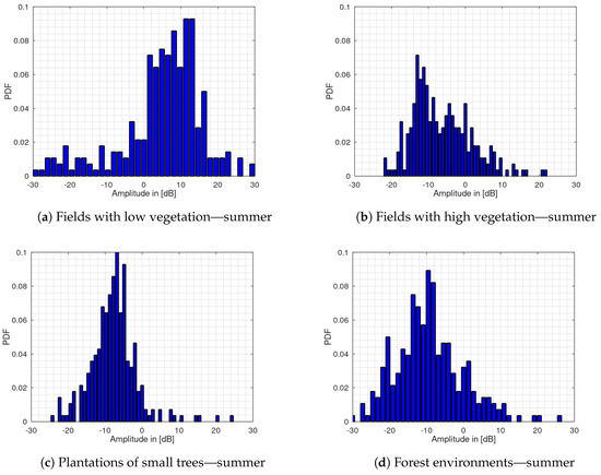 It can be seen that the histogram plots show a shifted probability density function for the fields with low vegetation to the right of the mean value. For the fields with high vegetation, plantation of small trees and forests, the probability density functions are shifted to the left. It can also be seen that the PDF appearance and width are clearly different for each terrain.