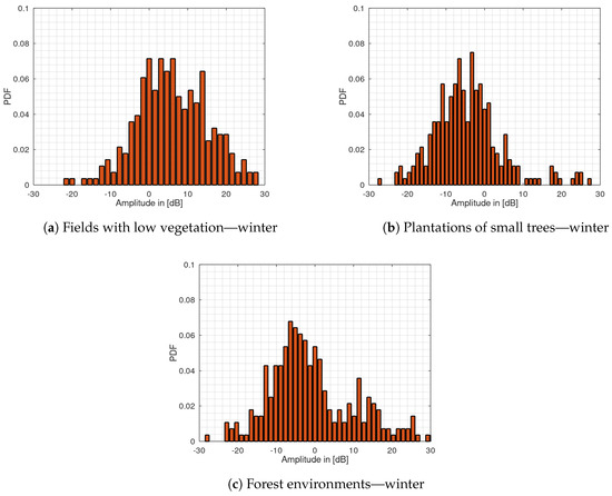Figure 6 shows the histogram plots for the measurements carried out in the winter. For the fields with high vegetation, no measurements have been made because during this season the terrain falls into the group of fields with low vegetation. It can also be seen in the data of the winter measurements that the PDF for fields with low vegetation also shows a shift to the right, whereas the other terrain groups show a shift to the left. This is the same behavior as for the measurements carried out during the summer. In general, the histograms for all terrain types show a flattened course for the winter measurements than the corresponding histograms for the summer measurements. The flattening of the histograms could be an indication of an increase in the clutter amplitude spread due to reduced vegetation at this time of year. To quantify the correlation of the histogram appearance for the different terrain types between summer and winter, the PCC between the fields with low vegetation, plantations of small tress and forest environments is shown in Table 1. The calculation for fields with high vegetation was not carried out, because this type of terrain is not available in winter.