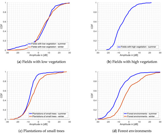 The cumulative distribution functions for the clutter amplitudes were calculated from the histogram values by cumulative summing up the histogram bins. The results are shown in Figure 7 for the various rural terrain types for winter and summer measurements. For the fields with low vegetation, only summer measurements are available in Figure 7b. As this type of terrain is only available during the summer, no measurement data were recorded. Instead, the empty fields then fall into the category of fields with low vegetation in winter. The CDF representation visualizes the density of the relative damping values. As expected, these are highest for forest environments, see Figure 7d, and lowest for fields with low vegetation in Figure 7a. During the transition from summer to winter, the density functions especially for plantations of small trees in Figure 7c and forest environments, move farther to the right. The steepest increase in slope of the CDF curve results for the terrain group of the plantations of small trees. This can also be seen from the corresponding histogram, as the amplitude values are centered around the mean value. It can be seen that the flatter the CDF curve, the larger the clutter spread.