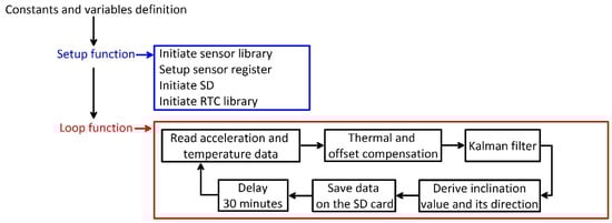 The single module prototype is composed of (i) a MEMS sensor; (ii) an Arduino® board; (iii) a local storage shield with a selectable memory capacity; and (iv) a power system. The measuring and logging electronic components are housed within a 10 cm × 10 cm × 7 cm waterproof box, and connection to the power system, housed within a separated, larger, waterproof box, is guaranteed by a waterp cabling system. The sensor selected for inclination monitoring, a LSM9DS0 MEMS IMU (STMicroelectronics, Geneva, Switzerland) [22], was soldered on a compatible pin hole Arduino® proto shield, installed on the Arduino® board for integration purposes. The power system is a stand-alone electrical source composed of a 50 W solar panel and a 12 V, 12 A lead battery. Battery recharge is managed by a 5 A max regulator. The selected sensor, an LSM9DS0 MEMS IMU has been already tested by the authors of [20] for understanding capabilities of onboard accelerometers in inclination measurement. The good performance after thermal optimization obtained by the authors of [21] indicated the suitability of this MEMS IMU in a field monitoring perspective. This IMU has nine degrees of freedom and is equipped with three accelerometers, three gyroscopes, three magnetometers, and a temperature sensor. It provides a digital output through the I2C communication protocol and has an onboard 16-bit Analog to Digital Converter (ADC). The maximum range of onboard accelerometers could be set at ±2, ±4, ±6, ±8, or ±16 g. This IMU sensor was selected because of the quite high resolution of the ADC, that allows a resolution of 0.061 g/least significant bit (LSB) in the setting range ±2 g. For system development, an Arduino® Uno board was used as reading and data processing interface [23]. This board has been chosen because of its simple use and low cost. The logic of the code developed for making the prototype work is reported in Figure 1. The code was developed and compiled using the Arduino® IDE environment. After first initialization of the variables, the libraries, acceleration, and temperature data are acquired by the sensors and read through the Arduino® board. Such data are optimized for thermal drifting and corrected for the presence of a measuring offset before being used for estimating inclination angles (δ, ρ, and θ; Figure 2). Such angles are used for estimating the inclination and its direction in space.