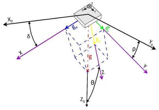 After optimization, acceleration data were used for estimating inclination of the MEMS IMU in space following standards of Figure 2. For converting acceleration data into inclination angles, multiple algorithms are available. These algorithms are based on the inverse tangent function, on the inverse sine function, or inverse cosine function [24]. Since the used sensor, equipped with three accelerometers, provides acceleration value along three orthogonal axes (i.e., x, y, and z), the angular values δ, ρ, and θ can be calculated with equations based on inverse tangent function (i.e., algorithms based on triple-axis method [25]). This algorithm has been chosen because of the accuracy and stability of the obtained results, the low computation resources needed in comparison with other algorithms, and its constant effective incremental sensitivity [26,27]. The equations below (1, 2, and 3) have been used to convert the gravity component on the axes in angular values: