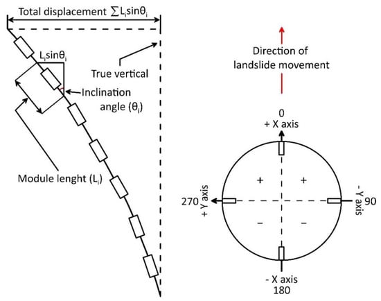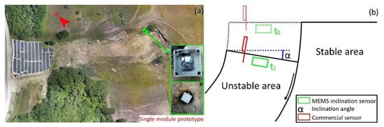 Multi-module systems are typically composed of multiple biaxial tilt measuring units that, forming a chain, can be installed within a borehole equipped with a specific inclinometer housing. Once installed, the system continuously acquires tilt data at different depths and converts them into a displacement. Cumulating displacement data along the chain, the total displacement at the surface can be derived [16]. These systems have been used in a number of landslide monitoring projects proving their potential to provide information about the number and location of sliding surface [17,18]. The use of such kinds of systems for early warning purposes is less common, even though results from the authors of [19], who developed a shallow monitoring system based on tilt sensors, indicate that these tools are promising also in landslide monitoring for early warning purposes.