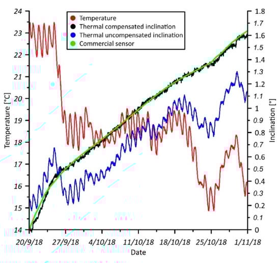 Results from field test are reported in Figure 4. The red line represents the temperature data registered by the onboard temperature sensor of the MEMS IMU. The blue and black lines represent the uncompensated and compensated inclination data registered by the prototype, respectively. The green line reports also the inclination values registered by the commercial sensor. The uncompensated inclination curve has a strong variability related to temperature trend, and the time series is completely different in comparison with that registered by the commercial sensor. Conversely, the compensated data show a good agreement with that registered by the commercial sensor indicating the efficiency of sensor optimization in removing drifting caused by temperature fluctuations. Especially, the evaluation of the RMSE indicated a final error estimated in 0.02°. Such low error indicates the potential of MEMS accelerometer sensors to be use in tilt-based monitoring applications, where medium to high accuracy is required.