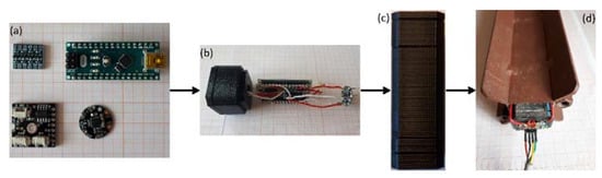 Diagram showing components and assemblage phases of the inclinometer modules. Especially, (a) shows the electronic components used; (b) shows the first assembly phase of the electronic components in the Acrylonitrile Butadiene Styrene (ABS) frame; (c) shows the appearance of the measuring unit composed by electronic components within the plastic housing; and (d) shows how a measuring unit is installed within the external steel case.