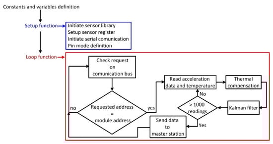 The logic of the code (reported in the Supplementary Materials) developed for making the module work is reported in Figure 6. Specifically, after first initialization of the variables and the libraries, the reading loop begins. The loop foresees a continuous reading of the measuring unit communication bus and is designed for reading data and sending them to the master station only under a specific address request. After the request of the master station, the Arduino® NANO board (Arduino S.r.l., Monza (MB), Italy) reads the accelerometer raw data from the onboard IMU sensors. Such data are acquired and optimized for removing potential drifting. Low-degree polynomial equations, parameterized during the thermal analysis of each specific MEMS IMU, were used for this purpose following recommendations of authors of [20]. After thermal optimization of acquired data, compensated data are filtered using a single-stage Kalman filter implemented in the code as a filtering pre-processing stage. To ensure filtering performance, 1000 acceleration readings are used for each inclination measure. Data filtering is needed because the estimation of the orientation in the space of the MEMS IMU requires only the knowledge of the component of the static Earth’s gravity acceleration. That is why potential dynamic acceleration components deriving from external excitation sources (i.e., vehicular vibration, anthropic vibration, etc.) have to be identified and removed. The Kalman filter is particularly suitable for this purpose being widely used for removing noise in low to high frequency data for many applications [33,34,35,36,37,38]. In this case, Kalman filter parameterization has been completed using a trial-and-error procedure driven by standard deviation estimation. In particular, a Q parameter of 1 × 10−3 and an R parameter of 7000 were used. Once compensated and filtered, data are sent by the Arduino® NANO to the master stations. The use of a data-upon-request strategy is crucial for ensuring the correctness of the displacement estimation and to make the system able to work in real conditions, especially considering the number of issues that need to be solved to avoid data loss. In this perspective, an important problem is related to the maximum distance of correct transmission of electrical pulses between two boards (i.e., the measuring unit and the master board).