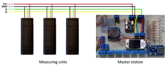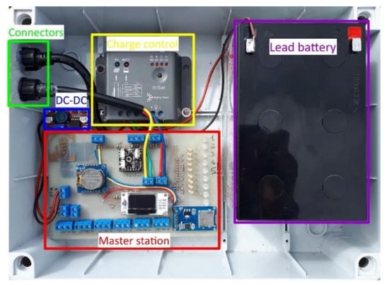 The developed board interface is composed of (i) a communication RS-485 interface, the same as that installed within each module; (ii) an Real Time Clock (RTC) clock connected via I2C bus; (iii) a micro SD module that is the local storage of the data; (iv) a 0.96 inch Organic Light Emitting Diode (OLED) display that allows displaying the main information about the status of the health of the modules and the registered deformation data (i.e., tilt, direction, and displacement), (v) nine LEDs programmed as a modules status check; and (vi) a number of connectors for interfacing other sensors or additional Arduino boards (e.g., for remote communication features). The master station is mounted within a waterproof box in association with power supply devices (Figure 8).